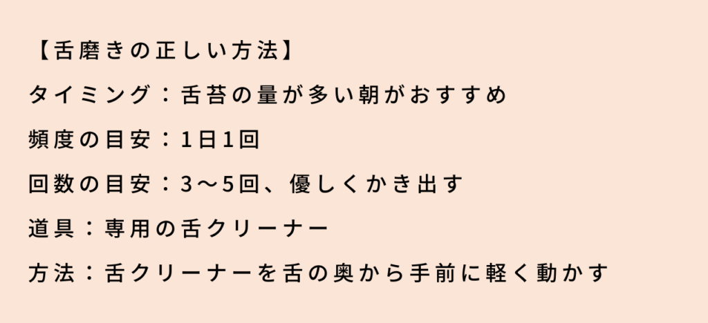 舌磨きの詳細は以下のとおりですので、ぜひ毎日の習慣に取り入れてみてくださいね。